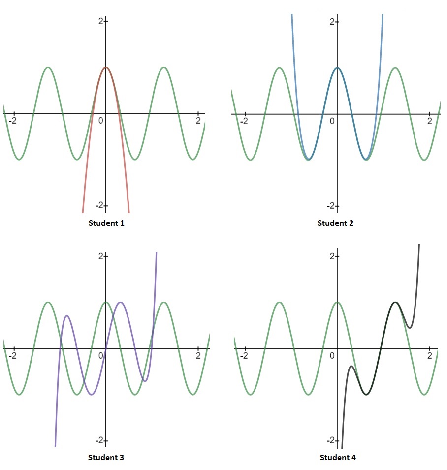 Four students attempted to find a Power Series approximation for \(\cos(5x)\) (graphed in green on all plots). In a few sentences, qualitatively describe what each student did and describe the range of values of \(x\) values for which their approximation is valid.