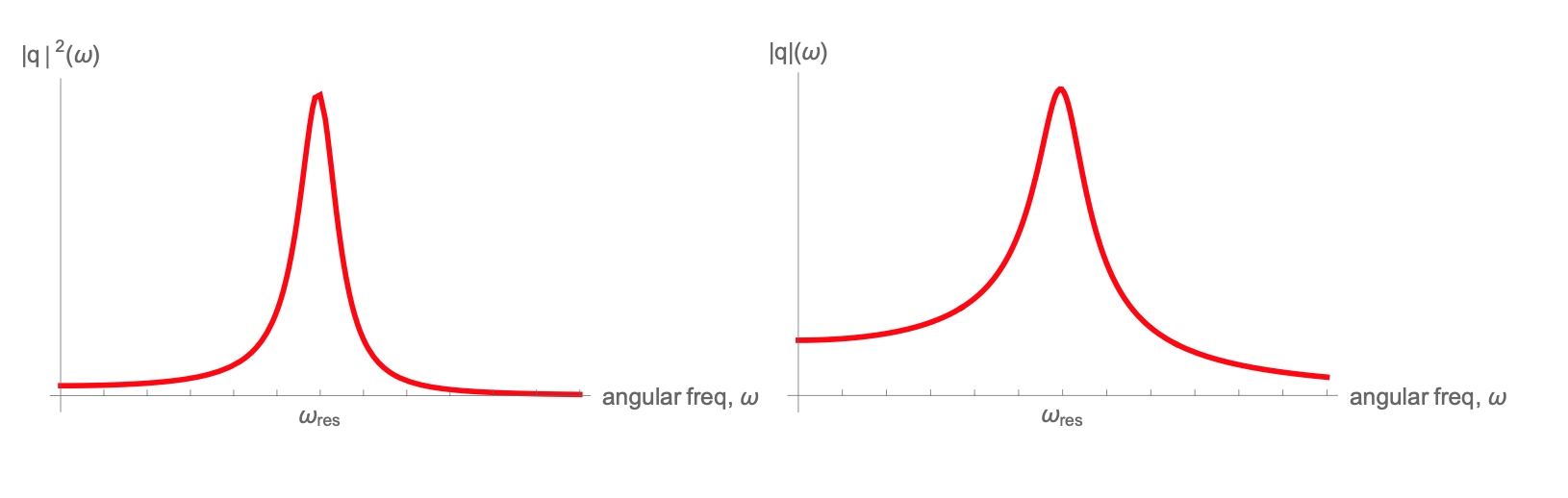 We define a “quality factor”, \(Q\equiv\frac{\omega_0}{2\beta}\), and use it as a measure of cycles in a free (undriven), damped oscillator before the oscillation decays to some smaller amplitude. The larger the number of cycles, the larger the \(Q\). Now let's see what this quantity translates to in a driven, damped oscillator. Use the example of charge amplitude\(|q|\) for a series LRC circuit.