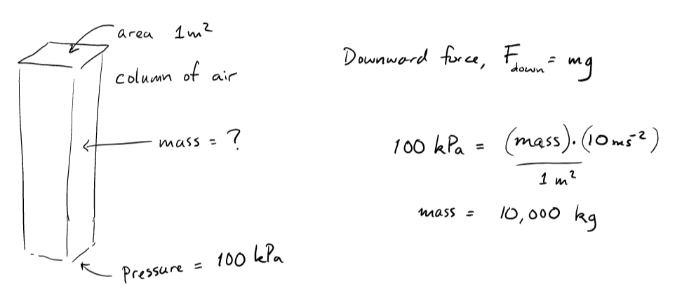 Google says the mass of the Earth's atmosphere is \(5\times10^{18}\) kg. I want to check this. First, consider a column of air.Every square meter of earth's surface has 10,000 kg of air directly above it. Radius of the Earth is \(\approx\) 6400 km. \begin{align} m_\text{atm} &= \left(4 \pi r_\text{earth}^2\right)(m_\text{sqr})\\ &= 4 \pi (6.4\times10^6 \text{ m})^2 (10^4 \text{ kg/m}^2) \\ &= 5\times 10^{18} \text{ kg} \end{align}![]()