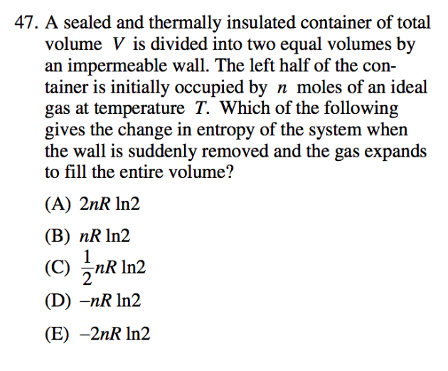 The volume doubles while \(N\) and \(U\) stay constant (there is no change in the internal energy of the gas). I'll put these quantitative statements into the expression for total entropy of a monatomic ideal gas. \begin{align} S_\text{initial} = k_\text{B} \ln\left(C V^N U^{3N/s}\right) \quad \quad \quad S_\text{final} = k_\text{B} \ln\left(C (2V)^N U^{3N/s}\right)\\ \frac{\Delta S}{k_\text{B}} = \ln C + N \ln (2V) + \frac{3N}{2} \ln U - \ln C - N \ln V - \frac{3 N}{2} \ln U \end{align} \begin{align} \Delta S &= k_\text{B} N \left(\ln(2V) - \ln V\right)\\ &= k_\text{B} N \ln 2 \end{align} This is option (B) in the GRE question.