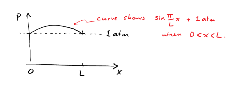 The graphs below show waves that have an anti-node a \(x=0\) and a node at \(x=L\). Outside bugle (\(x>L\)) the air pressure returns to normal. I have not shown the small ripple of sound leaving the bugle because pressure oscillations inside the bugle are much bigger than outside).