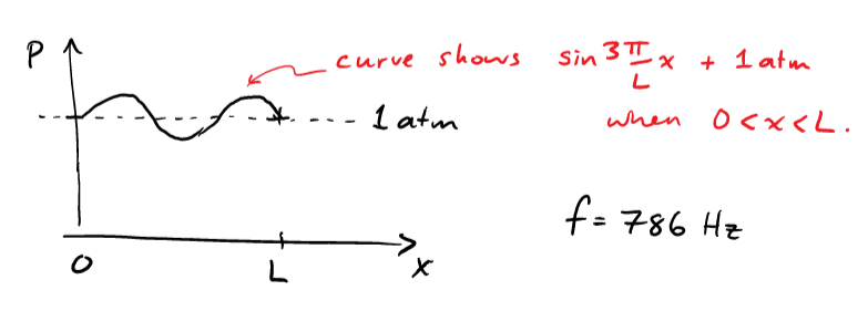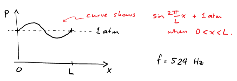This curve would oscillate at an angular frequency \(\omega = v \pi/L\). The cycles per second frequency is \begin{align} f &= \frac{\omega}{ 2\pi} \\ &= \frac{v \pi}{2 \pi L}\\ &= \frac{v}{2 L} \\ &= \frac{340 \text{ m/s}}{2(0.6\text{ m})} = 262 \text{ Hz} \end{align}![]()