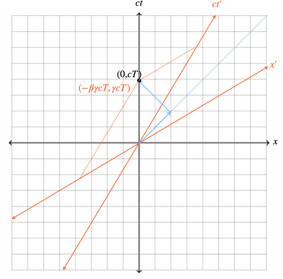 Similarly, if if I compare the time coordinates of the tick of my clock, I see the tick take \(cT\) while the other observer sees a longer time \(\gamma cT\). Since my clock is moving relative to the other observer, and they observe a longer time interval for the tick than I do, the other observer observes my clock running slow.
