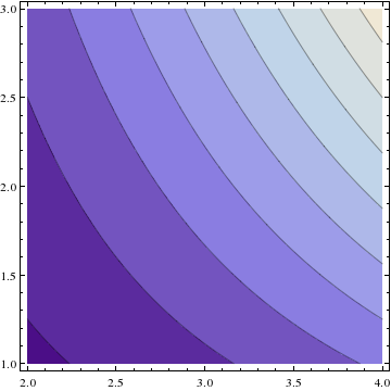 - A plot of the function \(20x^2y\) as well as a contour diagram near the point \((3,2)\) appear below.