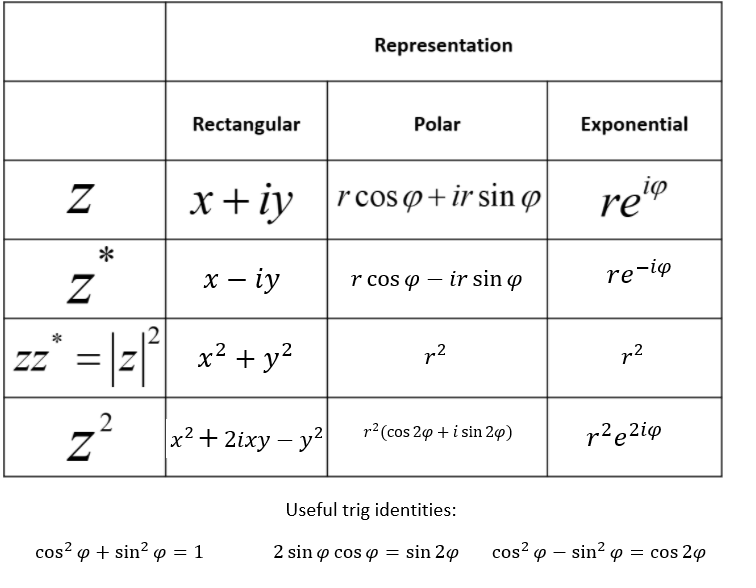 Representations of Complex Numbers--Table