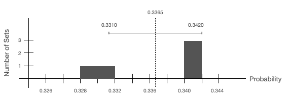 Plot a histogram of the probabilities you measured for each set. Use a bin size of 0.002 for the horizontal axis. (Choose appropriate values on the horizontal axis. You don't need to plot the full possible values 0-1. You may use a computer to make the histogram or you can sketch it by hand.)