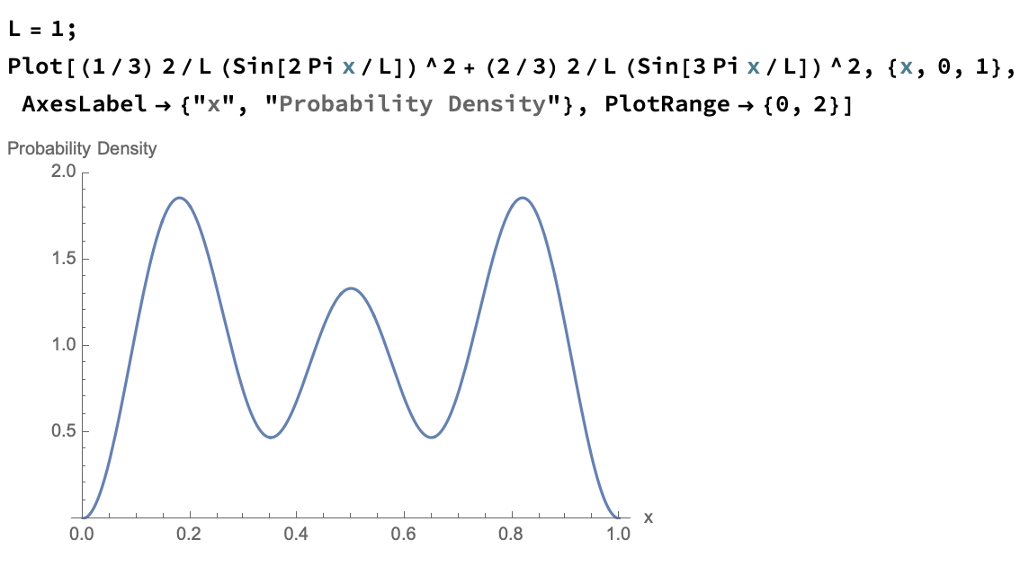 \[\psi(x,0) = \sqrt{\frac{2}{3L}}\sin\left(\frac{2\pi x}{L}\right) + \frac{2i}{\sqrt{3L}}\sin\left(\frac{3\pi x}{L}\right)\]