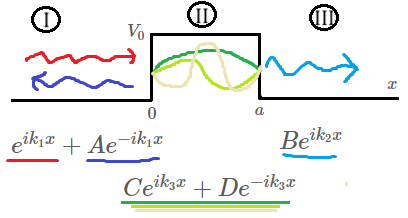 \begin{equation*} \psi(x) = \begin{cases} e^{ik_1x} + Ae^{-ik_1x} & x<0 \\ Ce^{ik_3x} + De^{-ik_3x} & 0<x<a \\ Be^{ik_2x} & a<x\\ \end{cases} \end{equation*}